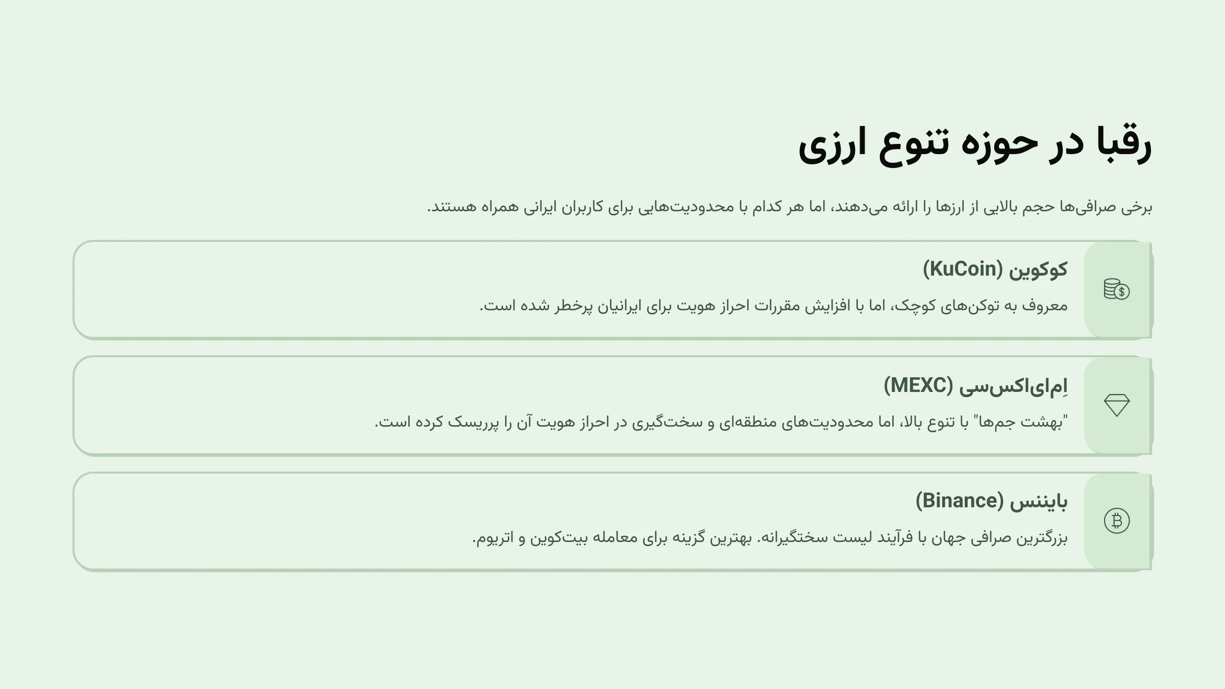 | کوکوین (KuCoin) | بسیار بالا | بله (اجباری) | بله | پایین (به دلیل ریسک KYC) |